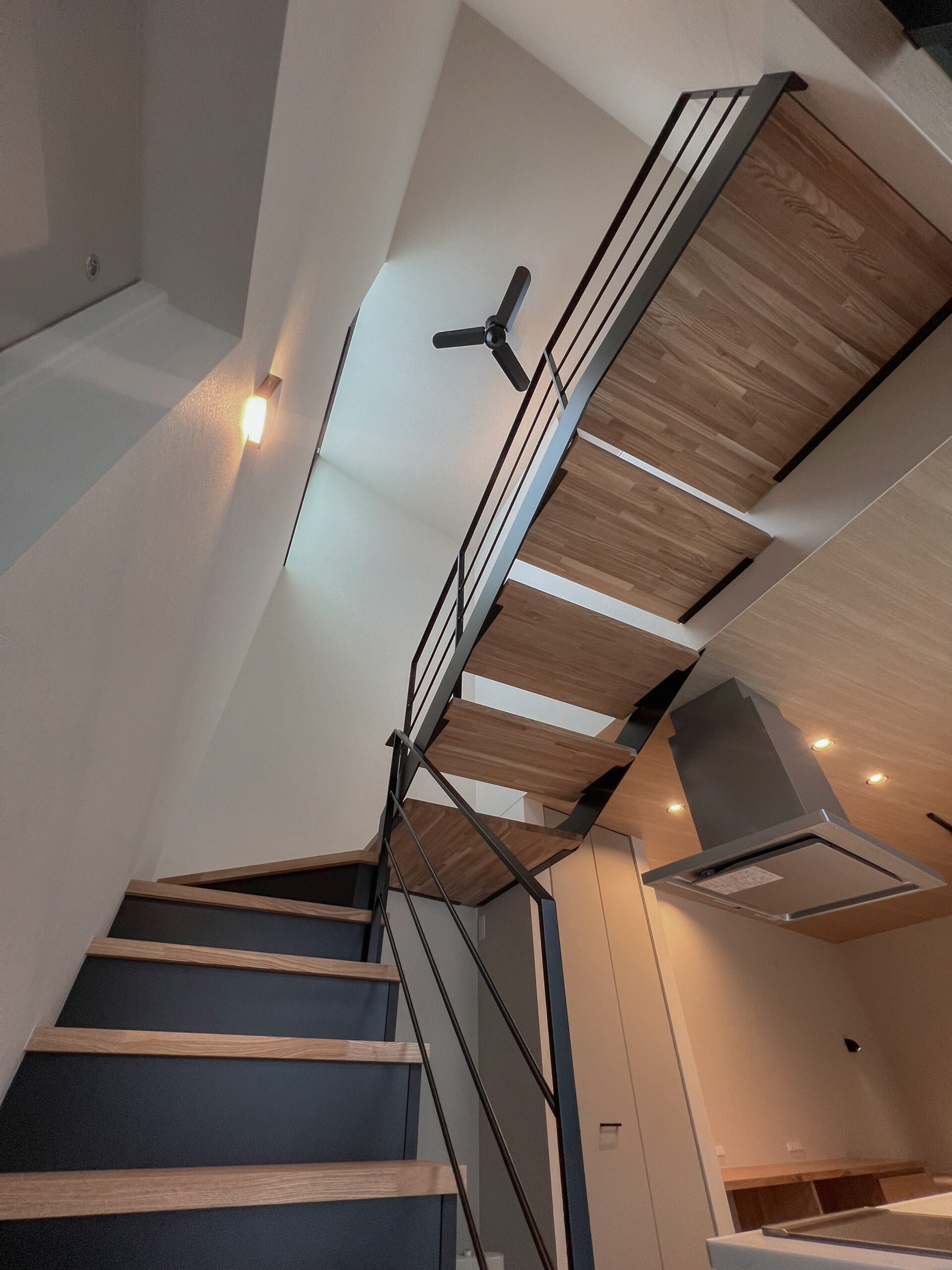 吹き抜けとスケルトン階段が視線を縦へと導き、面積以上の圧倒的な開放感を演出