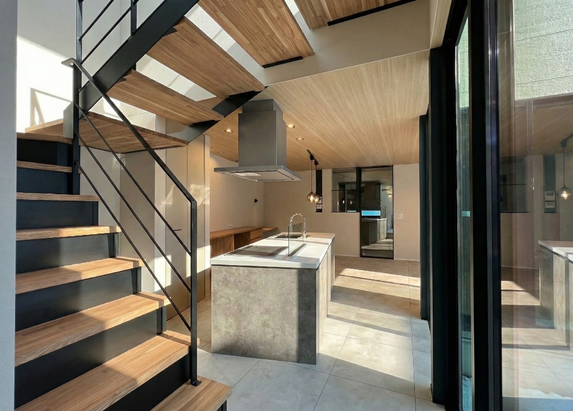 天井の「木目」の温かみに対し、キッチンの「石目調」や階段の「黒いアイアン」など