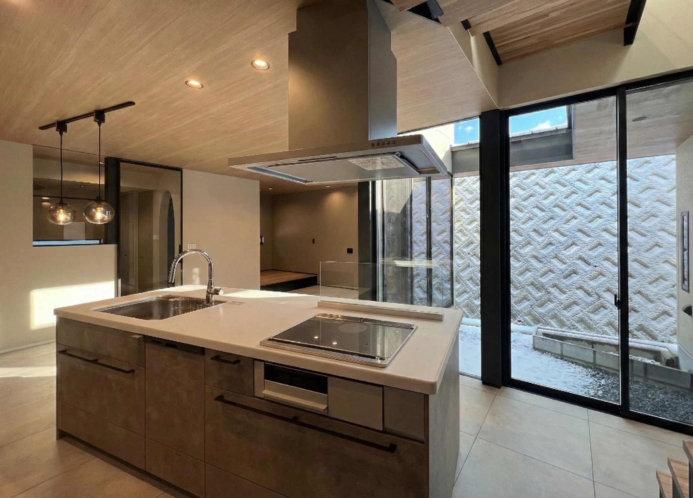 キッチンに立つと、中庭と階段の大きな窓から青空が望めます