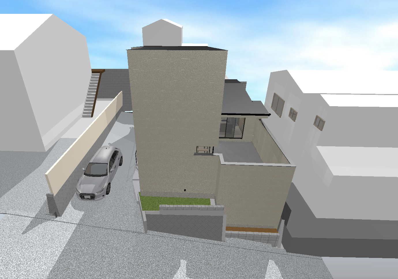 建物の基礎を深基礎形式として堀込車庫を撤廃して、その上部を中庭として活用する